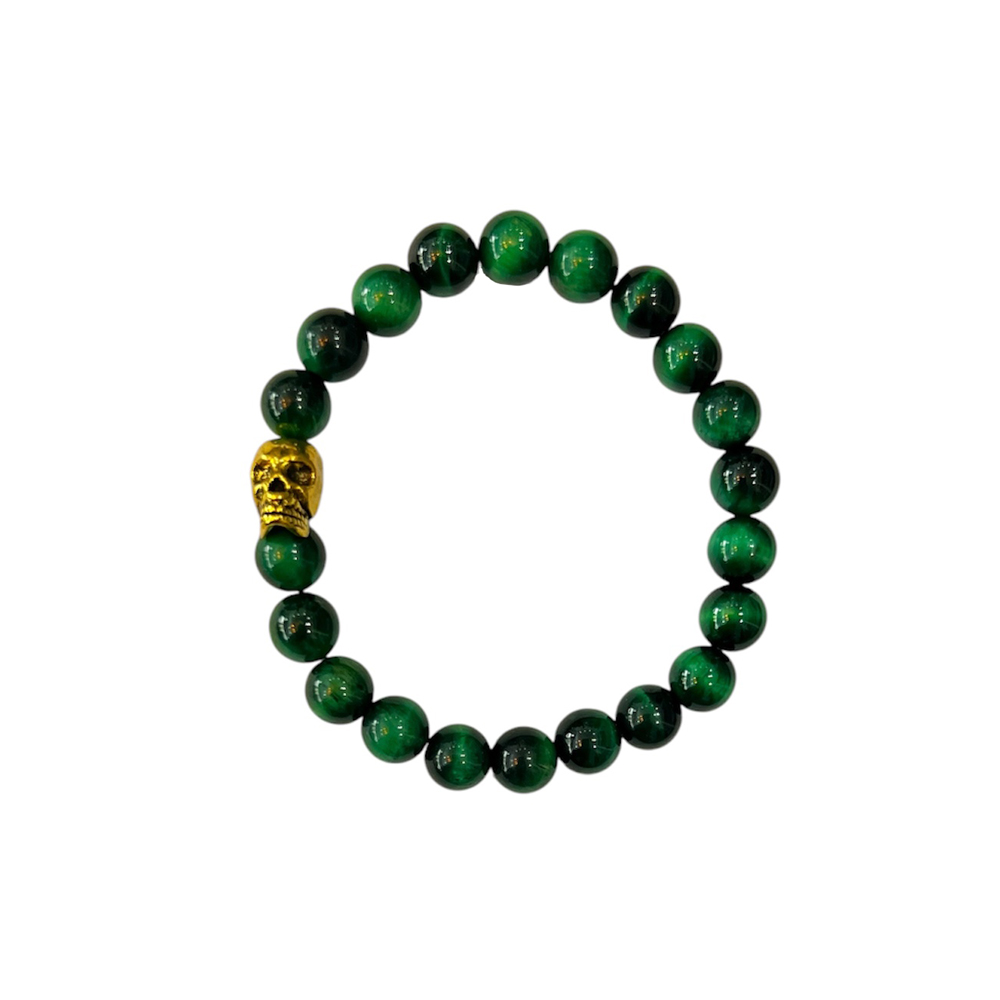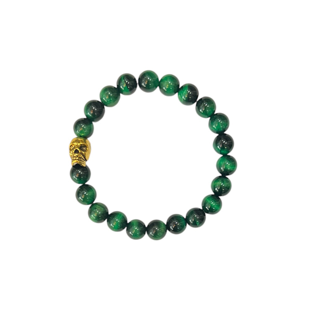 Réalisé à la main, il est constitué de pierres semi-précieuses, l’oeil de Tigre vert. Une perle en métal doré vient finir ce Bracelet Tiger.