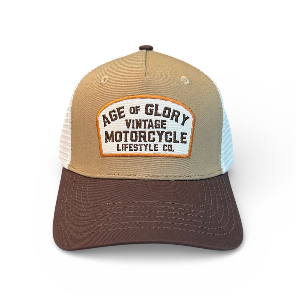 Casquette Trucker marron, beige et écrue, brodée. Elle est est réglable donc peut convenir au plus grand nombre. Réalisée dans un mélange de coton et Polyester, elle sera résistante.