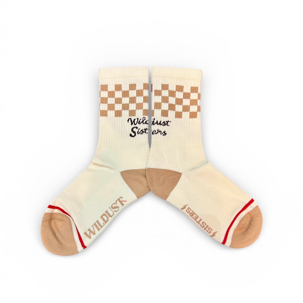 Chaussettes de sport en coton, polyamide et élasthanne. Pointure 36-42. Elles sont imprimés d’un damier beige si cher au racing.