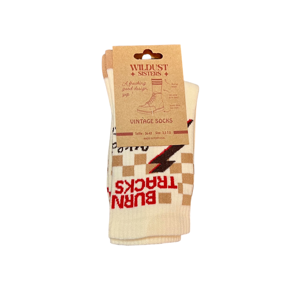 Très confortables, elles sont renforcées sous le pied. Conçues comme des chaussettes de sport, elles sont très agréables et tiennent bien sur la jambe. On aime leur design avec le drapeau checkers beige sur fond écru avec un éclair. Et surtout leurs slogan : Burn Tracks sur une jambe et Eat Dust sur l’autre.