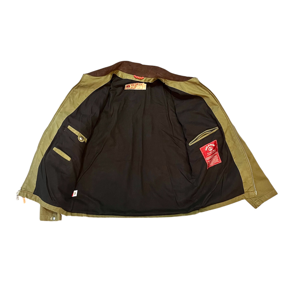 La Sanjon Jacket de Iron and Resin est une Service Jacket doublée de coton noir. Elle est très facile à portée grâce à sa coupe simple et sa couleur kaki. Equipée de 3 poches extérieures, elle en possède également 3 autres à l’intérieur. Son col en velours Milleraie marron est un basic efficace.