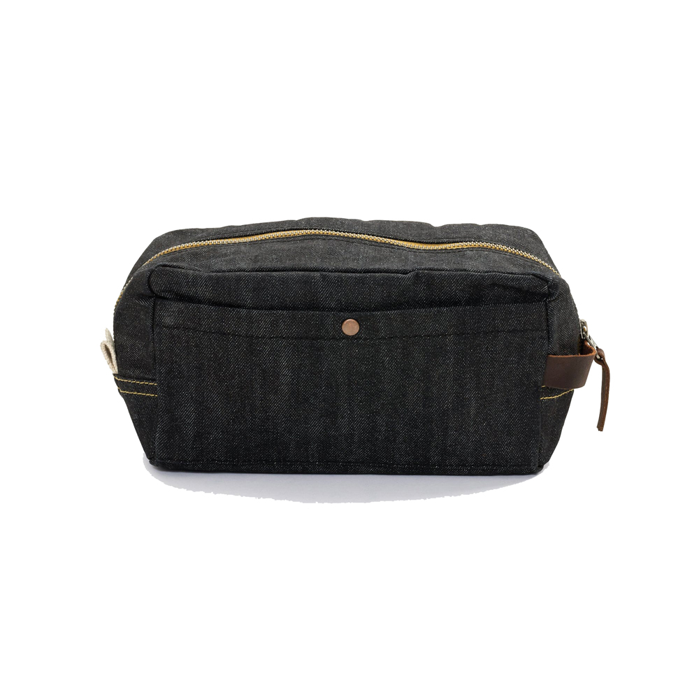 Trousse de toilette en Denim 14,5 Oz, poignée en cuir, dimensions 25 x 12 x 12 cm.